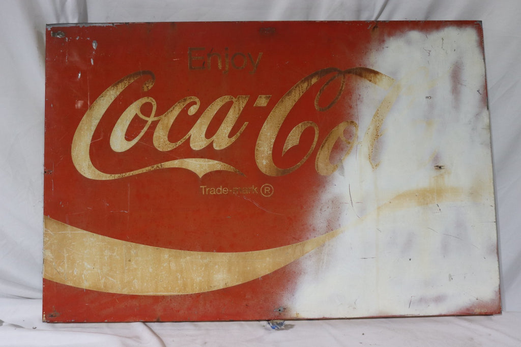 The product is a vintage Coca-Cola sign featuring a rustic, white spray painted design. This heavy metal sign is a collectible advertising piece that showcases the iconic Coca-Cola brand logo and theme. Made in the United States, this original sign is a unique and nostalgic addition to any collection of vintage Coca-Cola memorabilia. The red color and vintage aesthetic make it a standout piece for fans of classic soda advertising.