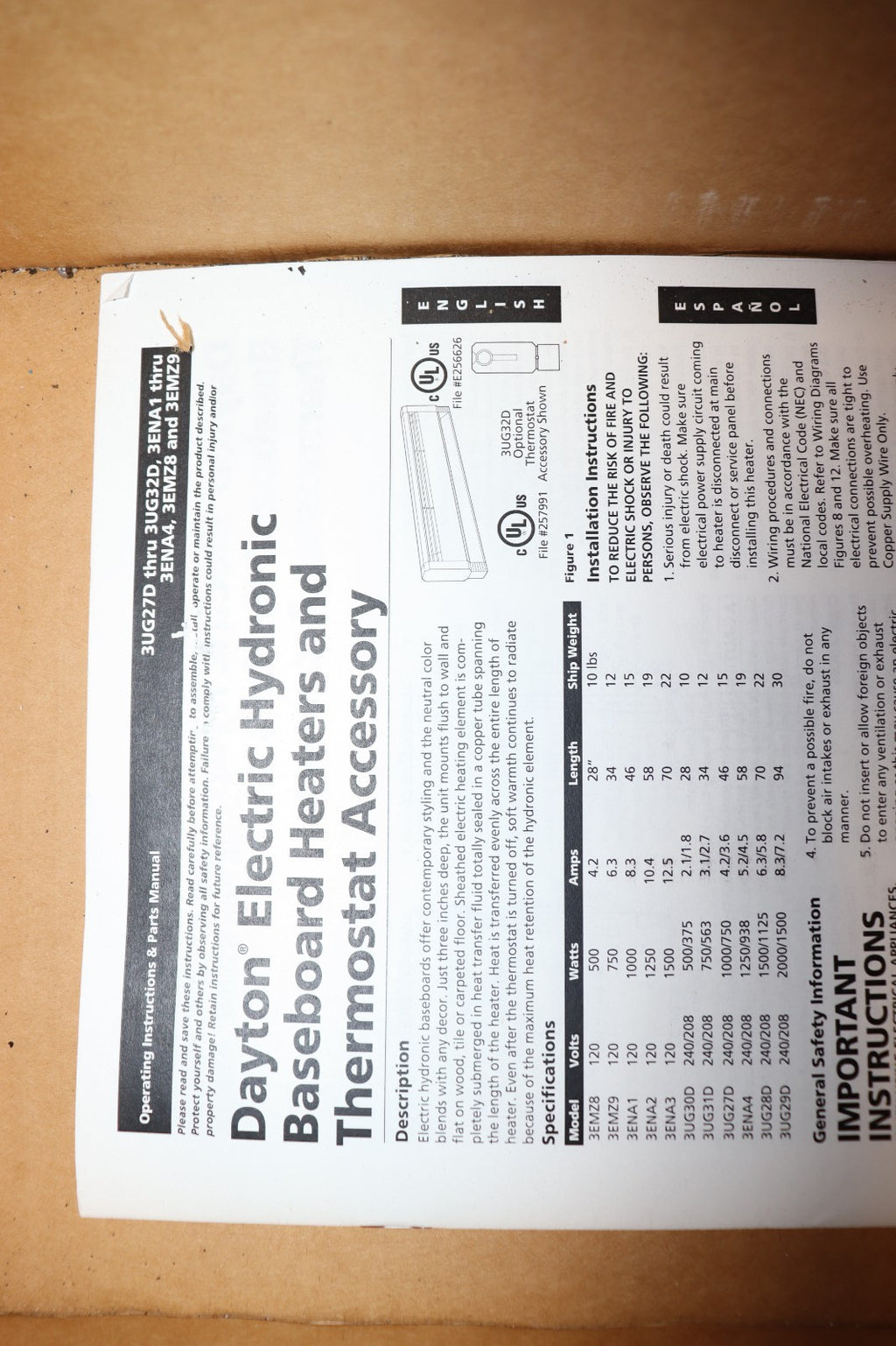The Dayton Baseboard Heater Commercial Grade, model 3UG27D, is a high-quality and durable heating appliance designed for commercial use. With a radiant heating system and a white color finish, this heater efficiently and effectively provides warmth to any space. The baseboard mounting location allows for easy installation and a seamless appearance. With a single heat setting and the trusted Dayton brand, this heater is a reliable choice for maintaining a comfortable temperature in any room.