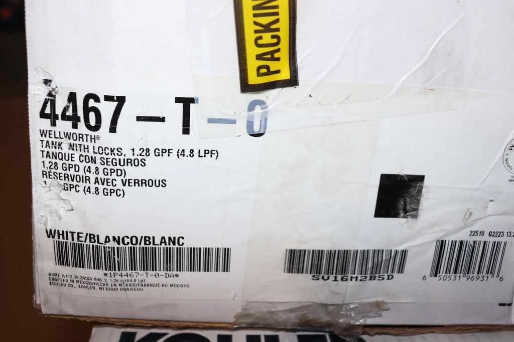 The KOHLER Wellworth 1.28 Gpf Tank, w/ Locks K4467-T in White is a toilet tank suitable for use in bathrooms. Made of Vitreous China, this 12 inch tank features gravity-fed flushing technology and is designed for a toilet. Manufactured by KOHLER, this tank is a replacement part for KOHLER toilets and comes in a sleek white color, fitting seamlessly into any bathroom decor. With a size of 22 inches in length and 20 inches in width, this tank is durable and reliable for long-term use.