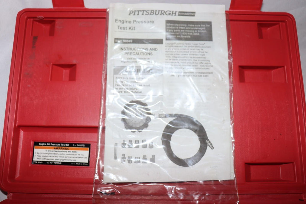 The Pittsburgh Engine Oil Pressure Test Kit is specifically designed for diesel engines, with a maximum PSI of 140. This kit includes a carrying case for easy storage and transportation, making it convenient for on-the-go inspections. Manufactured part number 11AU and made in China, this reliable tool is essential for accurately detecting leaks in your vehicle's engine.
