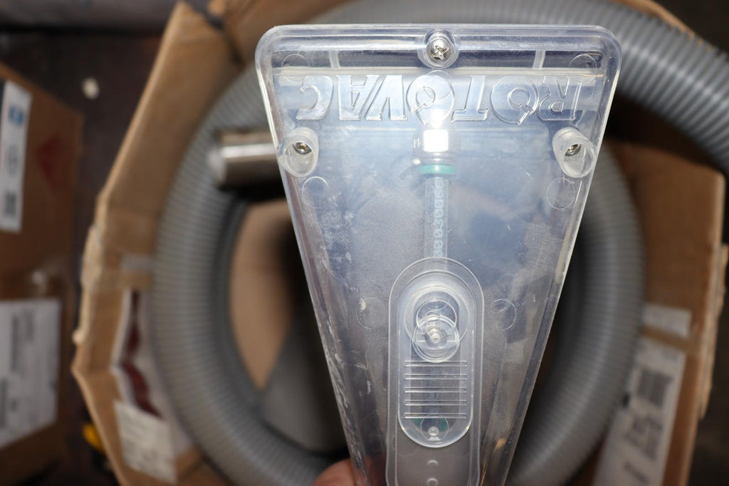 The Rotovac Shear Dry Upholstery Cleaning Tool is a specialized equipment designed for cleaning upholstery with low moisture. This tool, specifically made by the brand Rotovac, is perfect for efficiently removing dirt, stains, and excess moisture from upholstery surfaces. The included hose makes it easy to reach hard-to-clean areas, ensuring a thorough and effective cleaning experience. Ideal for use in various cleaning and janitorial applications, this upholstery tool provides reliable performance and professional results.