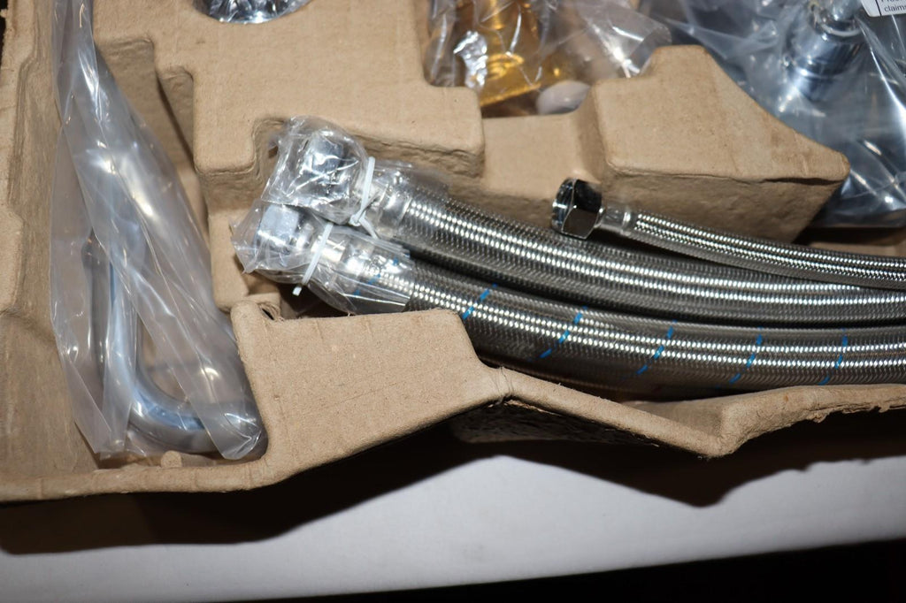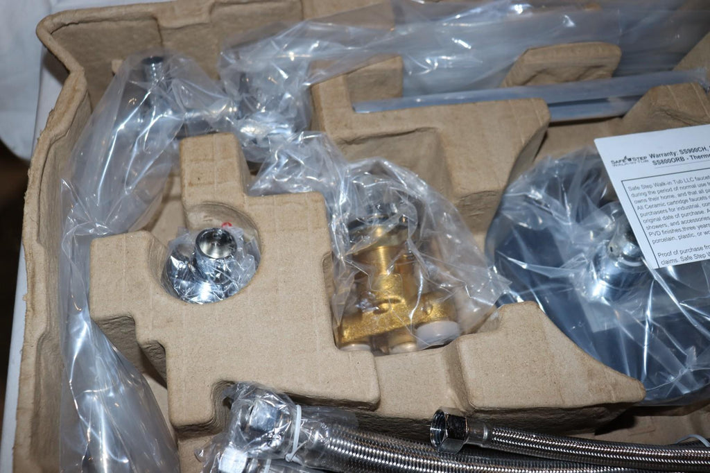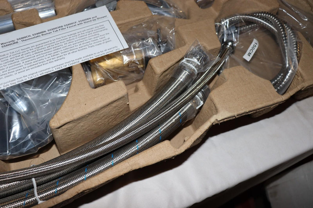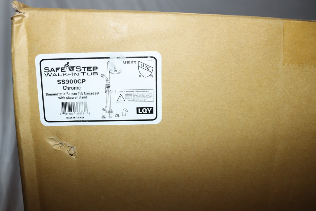 The Safe Step WalkIn Tub Chrome Thermostatic Roman Tub Faucet Set, SS900CP, with Stand is a modern and stylish addition to any indoor spa bathtub. This deck-mounted faucet set features a polished silver finish with a chrome material, round shower head shape, and thermostatic temperature control. It includes one faucet handle, four faucet holes, and a 9 lb weight. The assembly required unit comes with a shower head included and is suitable for creating a luxurious bathroom experience.
