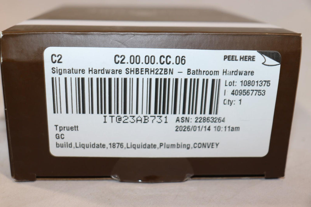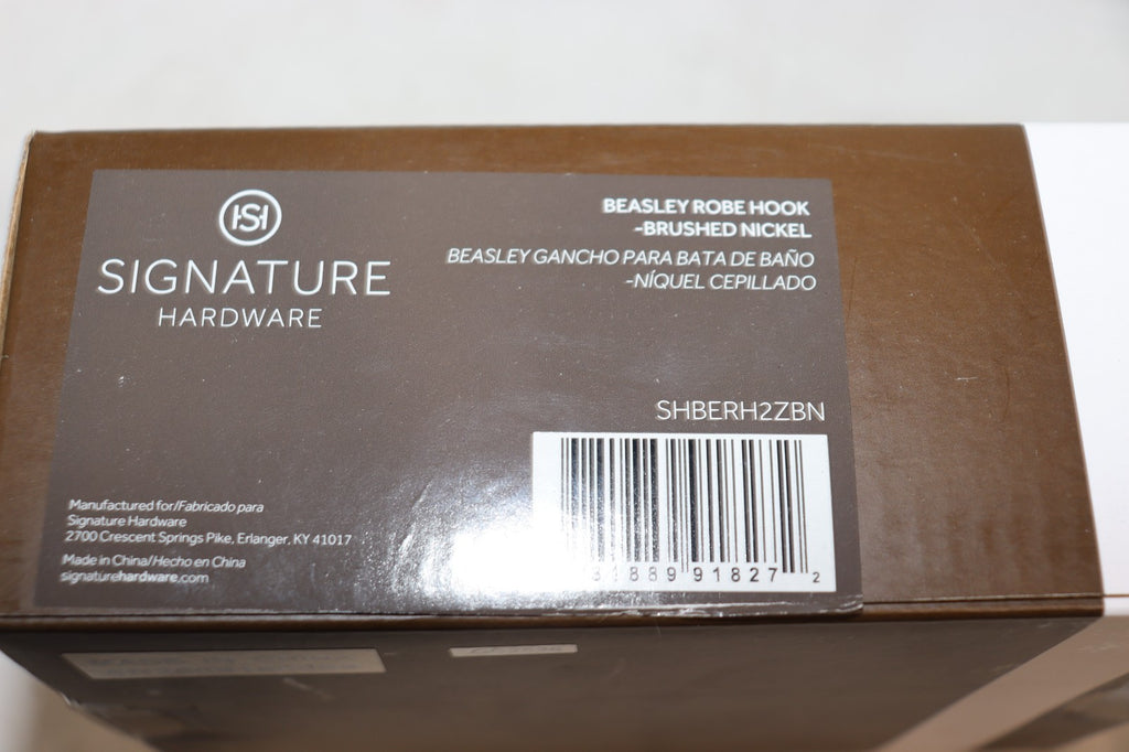 The Signature Hardware SHBERH2ZBN Beasley Robe Hook in Brushed Nickel is a stylish and functional addition to any bathroom. This wall-mounted hook features a sleek design with a single hook perfect for holding robes or towels. The brushed nickel finish adds a modern touch to your decor, making it a practical and attractive choice for your home.