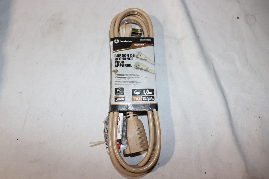The Southwire Appliance Replacement Cord is a 6-foot extension cord with 14/3 gauge conductors and a 15-amp maximum input current. It features a United States plug type and is suitable for indoor use. The cord is designed for maximum compatible appliance wattage of 750 - 1875 W and has one outlet. This product is ideal for replacing worn out or damaged appliance cords and is a reliable solution for powering various household appliances.