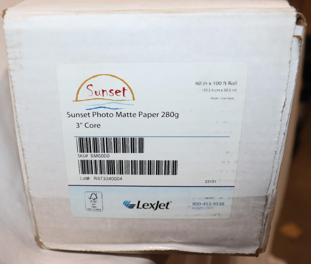 The Sunset Photo Matte Paper 280g is a high-quality printing material ideal for aqueous and latex printing. With a size of 60in x 100ft, this paper offers a large printing area for various graphic designs. The white exterior color and white frame color provide a clean and professional look to any print. Compatible with various printing models like the Sunset SM6000, this paper is a versatile choice for business and industrial printing needs.